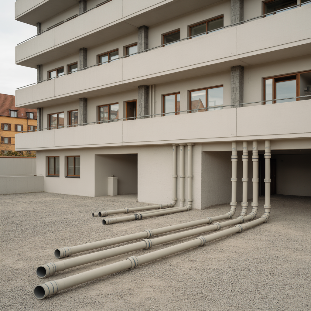 De gamla gjutjärnsstammarna demonterades våningsvis och ersattes med ljuddämpande plaströr för spillvatten med rätt dimensioner och fall, kompletterat med rensmöjligheter i botten och vändpunkter. Tappvatten drogs om med PEX i skyddsrör från källarplan upp via schakt till lägenheternas fördelningspunkter, med tydlig märkning för kallt, varmt och VVC där sådan fanns. Samtliga nya vattenledningar isolerades med slutna cellmaterial för att motverka kondens och reducera värmeförluster, och rören fixerades med vibrationsdämpande klammer. Genomföringar i bjälklag och väggar brand- och ljudtätades enligt klassningskrav, och de öppnade ytorna återställdes efter färdig installation. I våtrum säkerställdes att anslutningar till tätskikt förbereddes enligt gällande branschregler.